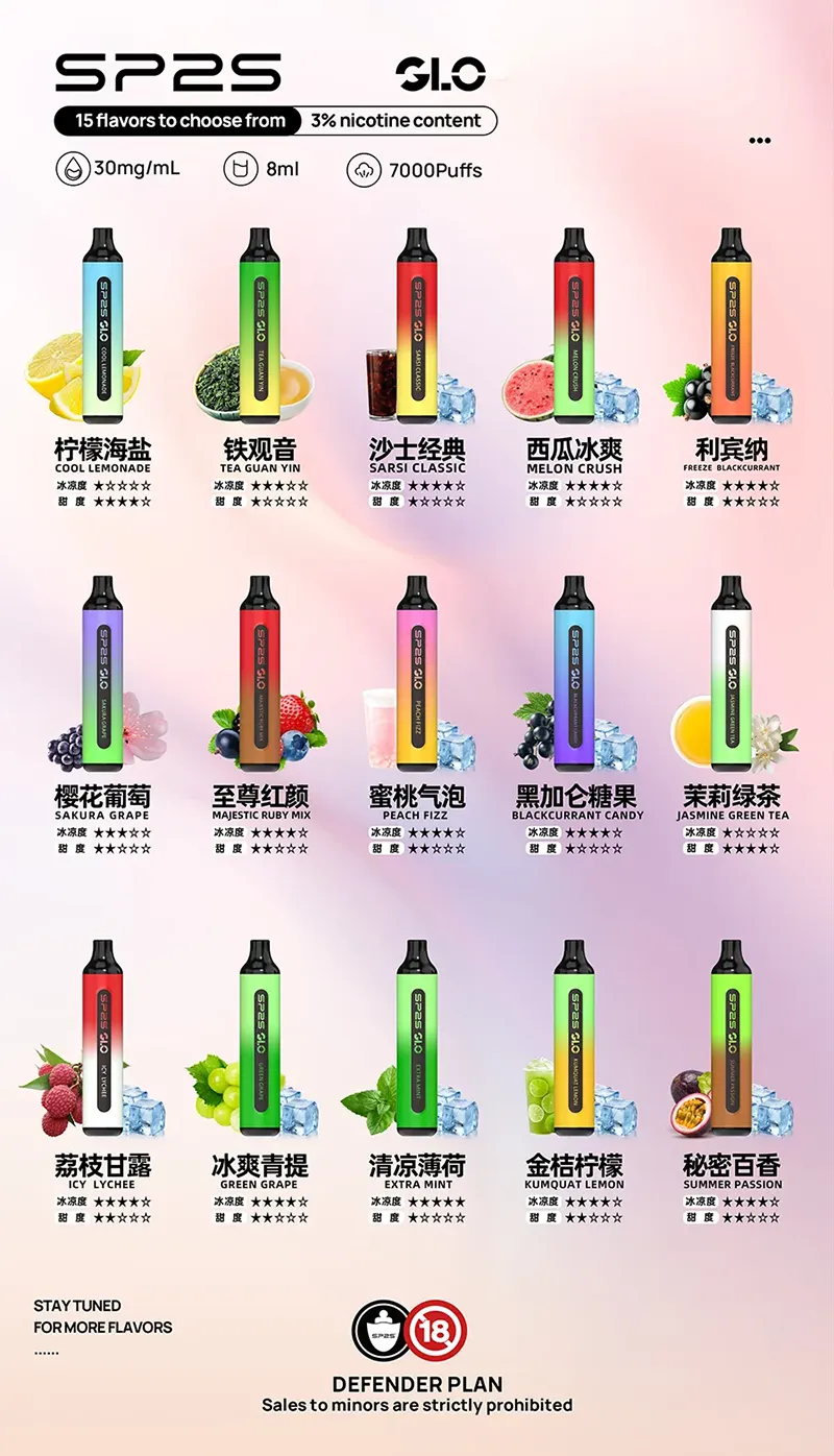 一次性電子煙推薦 SP2S GLO,結合可充電設計與智慧防漏油技術,提供穩定煙霧和順滑口感。輕巧便攜,適合日常使用與嘗鮮。作為電子煙 拋棄式產品,兼具解癮與便利性,適合在一次性電子煙蝦皮平台購買。每一款口味都為不同心情與場景設計,從童年到成年品味,SP2S GLO 一次滿足。